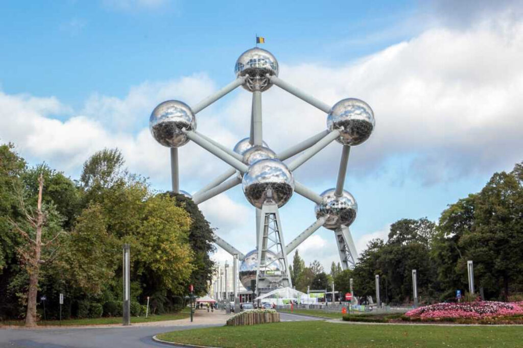 El Atomium es una estructura de 102 metros de altura construida para la Exposición General de primera categoría de Bruselas de 1958. Representa un cristal de hierro ampliado 165 mil millones de veces. Está formado por nueve esferas de acero1de 18 metros de diámetro cada una. Está ubicado en el parque de Heysel en Bélgica.