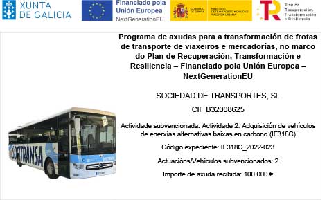SOCITRANSA usufrue do Programa de axudas para a transformación de frotas de transporte de viaxeiros e mercadorías, no marco do Plan de Recuperacion, Transformación e Resiliciencia. Financiado pola Unión Europea – NextGenerationEU.